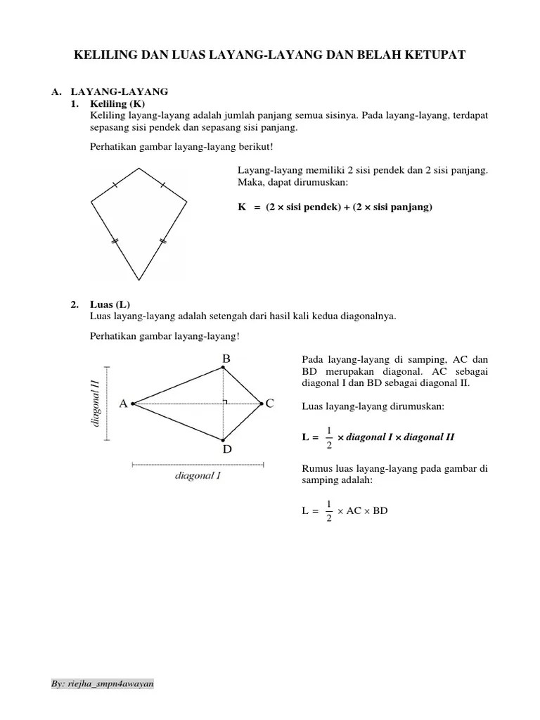 Jika kau lupa lagi rumus dan keliling . Kamu dapat download modul & contoh soal serta kumpulan latihan soal lengkap . Bahkan adapula beberapa contoh soal layang layang terkait rumus rumus tersebut. Dengan rumus luas = ½ x d1 x d2. Tidak heran jika bangun datar ini sering digunakan sebagai soal .